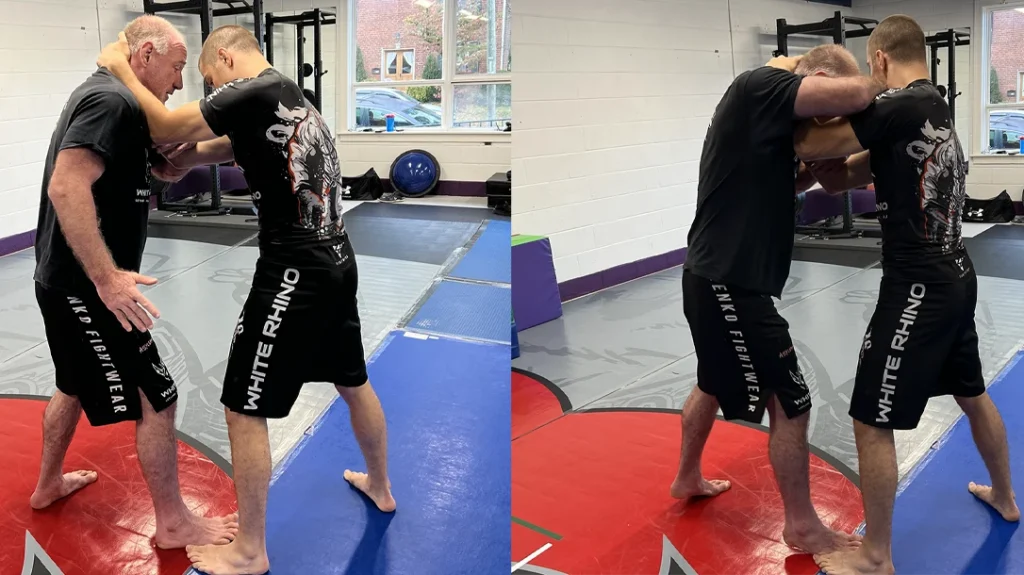 In close, though, groin strikes become effective weapons that are difficult to stop. Most combat sports don’t worry about dealing with groin strikes. So their stances tend to be somewhat squared up to the opponent leaving a vulnerable gap between their legs. In the old-fashioned version of lethwei Dunlap practiced, fighters took a much more bladed stance in clinches. They rotated their hips toward the side while almost placing their legs on a straight line. Besides protecting your groin, that position makes it relatively easy to attack with your lead leg to the opponent’s groin. You just lift your knee or instep up between their legs to strike.