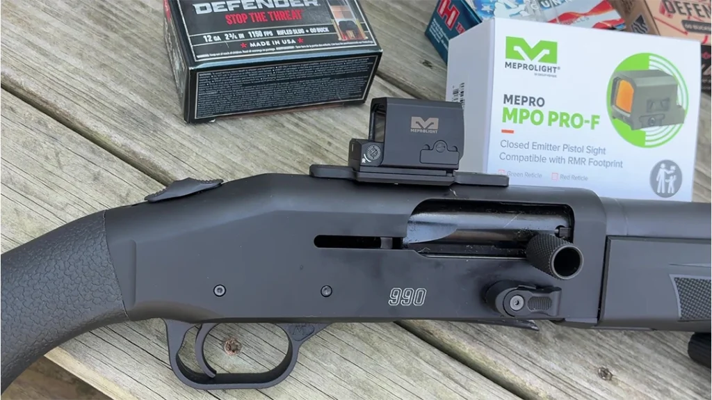 I like the Meprolight MPO Pro-F because its enclosed-emitter housing isn’t affected by weather or environmental conditions.  Rain, snow, and debris cannot interfere with the dot reticle, enabling accurate shooting in any conditions. This red-dot sight feeds on a CR1632 battery that gives up to 20,000 hours of runtime. I also found its multi-reticle system to work quite well with the Mossberg 990 AfterShock.