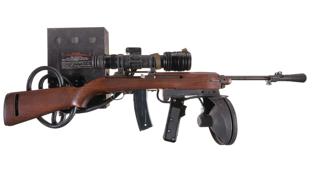 The M-3 appeared late in World War II. Also called the T-3, this Carbine was an M-2 equipped with an infrared night scope. The scopes were large and heavy, used a large backpack battery, and required a two or three-man team. The infrared images were blurry and greenish, but the scope worked. 150 specially-trained M-3 night sniper teams deployed to Okinawa against Japanese infiltrators. They were so effective that the M-3 teams reportedly accounted for about 30 percent of Japanese casualties on Okinawa.